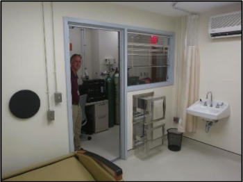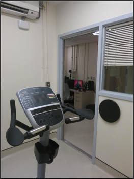 Exercise WRIC with an interior volume of 14,804 liters. This shows a cycle ergometer but the three-meter ceiling height also allows use of tall exercise equipment. Notice the blood sampling access port on the right side wall.