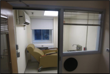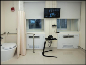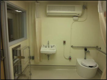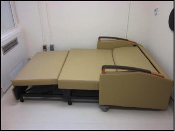 23-hour studies WRIC interior showing all of its components – restroom, bi-level pass through’s, AC unit and bariatric sofa bed.
