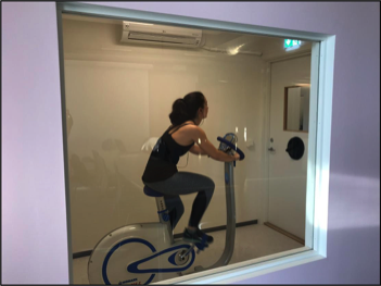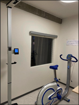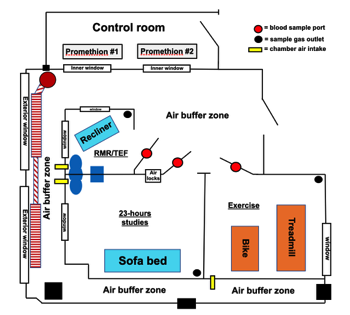 Exercise WRIC, with an interior volume of 14,233 liters, is shown with a cycle ergometer and a scanner for determining subject anthropometrics prior to the metabolic test.
