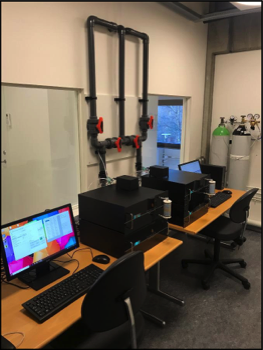 Control room with two Sable Systems Promethion instruments. The valve system shown allows the two instruments to be interchanged among the three WRIC’s. These integrated instruments measure oxygen, carbon dioxide and water vapor pressure within the WRIC. This eliminates the need for drying the sample gases. Notice the small foot print of the instrumentation.
