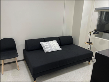 Interior of the 23-hour studies WRIC containing a futon bed, small desk and chair. The 24,034 liter interior volume allows for a comfortable environment for subjects during metabolic and macro-nutrient utilization measurements.