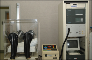 (2000): Updated infant whole room indirect calorimeter I developed at Miami Children’s Hospital, Department of Research. Climate control was provided by a hospital blanket cooler (center). Hartman & Braun upgraded instrumentation was utilized (right). Notice the gloveless interaction ports to provide more natural parental/care giver interaction with infants during metabolic measurements (left).