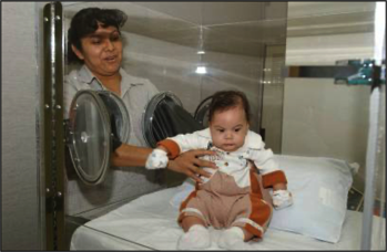 Parental/care giver interaction during metabolic measurements utilizing the new gloveless access ports in the upgraded infant indirect calorimeter. Greater natural contact between infants and their parents/care givers further reduces anxiety due to separation, thus improving the accuracy of metabolic measurements.