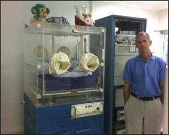 (1996): I developed the worlds first practical whole room indirect calorimeter at Maimonides Medical Center, Department of Pediatrics in 1996. This measured all the components of energy expenditure including physical activity. Notice the gloves that allowed interaction with the infants by parents/care givers during metabolic measurements and the balance below the bed platform for measurement of infant physical activity.