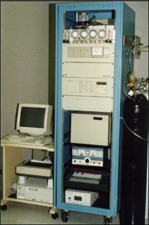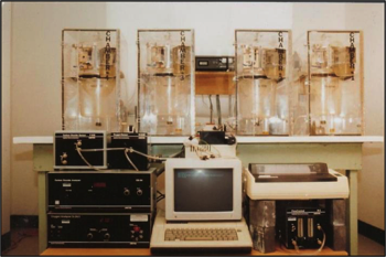 (1985): First rodent multi-chamber indirect calorimeter I developed at the University of Arizona, Department of Nutrition in 1985. The system utilized Ametek analyzers and an Apple 2e computer. Notice the inserted Nalgene rodent metabolic cages thus allowing measurement of all the components of rodent energy expenditure in up to four rodents simultaneously.