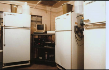 (1983): I developed the first indirect calorimeter for poultry at the University of Arizona, Department of Nutrition, in 1983. It featured multiple chambers that housed two laying hens each. Used refrigerators were utilized since they already had a cooling system. Furthermore, they allowed development of the system at greatly reduced costs. The system utilized Ametek analyzers and an Apple 2e computer.