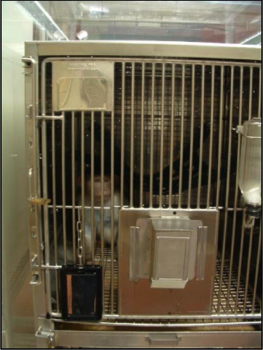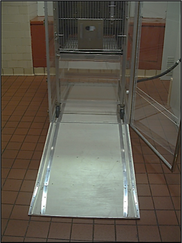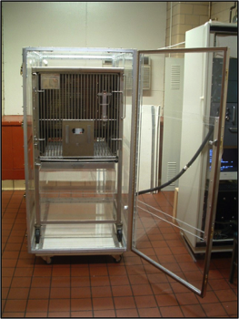 Monkeys were transferred into this specialty designed metabolic cage in another room and then brought into the room calorimeter lab to be placed within the monkey indirect calorimeter chamber (left) by just rolling it up the ramp (right).