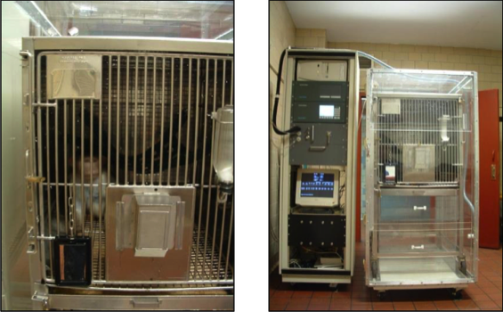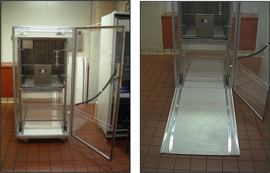 Monkeys were transferred into this specialty designed metabolic cage in another room and then brought into the room calorimeter lab to be placed within the monkey indirect calorimeter chamber (left) by just rolling it up the ramp (right).