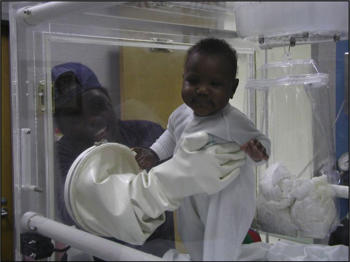 Parental/care giver interaction during metabolic measurements utilizing the new gloveless access ports in the upgraded infant indirect calorimeter. Greater natural contact between infants and their parents/care givers further reduces anxiety due to separation, thus improving the accuracy of metabolic measurements.
